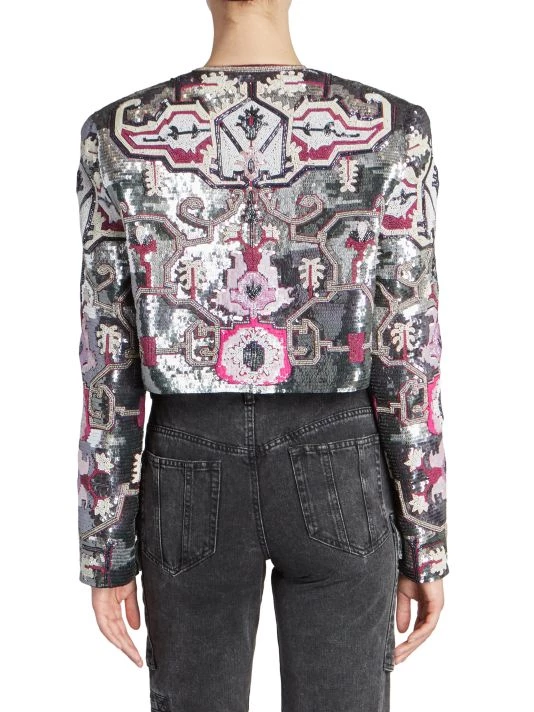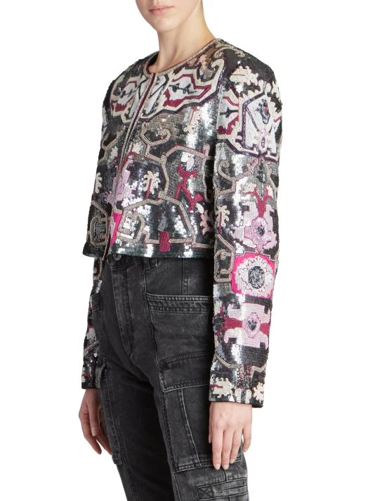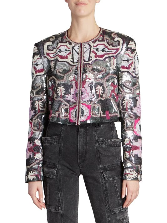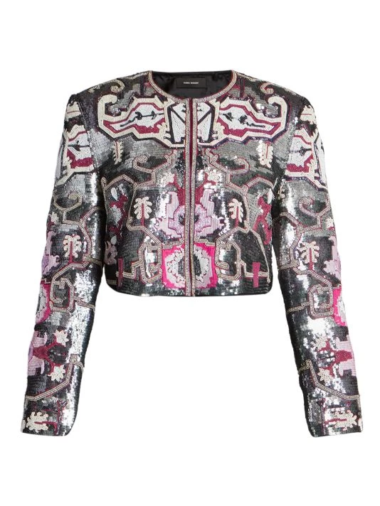 Boasting an intricately beaded and sequined pattern, Isabel Marant’s Harmon cotton jacket features a boxy silhouette with a collarless neck and slightly cropped hem.