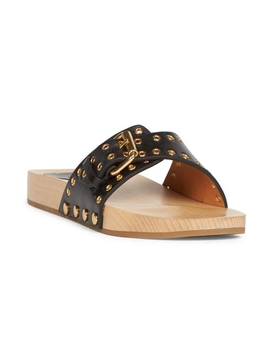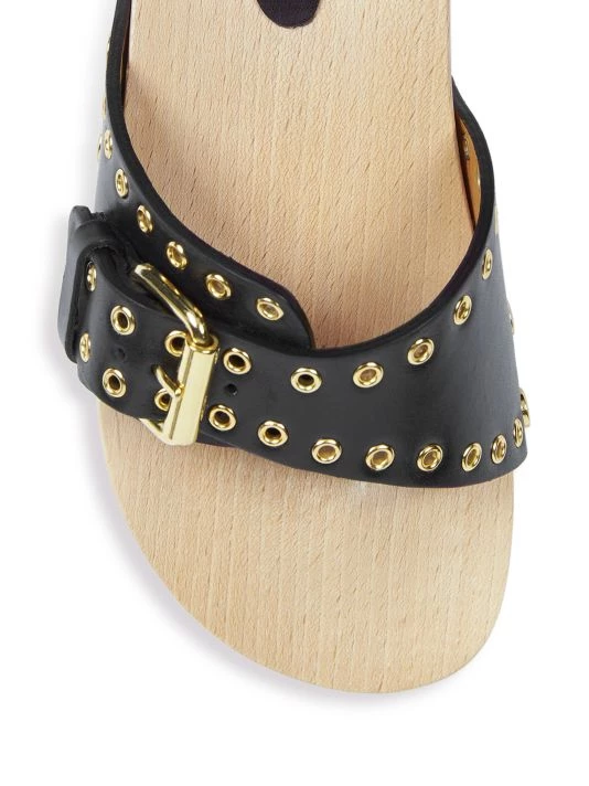 Goldtone grommets lend flair to these leather slide sandals with a wooden platform.