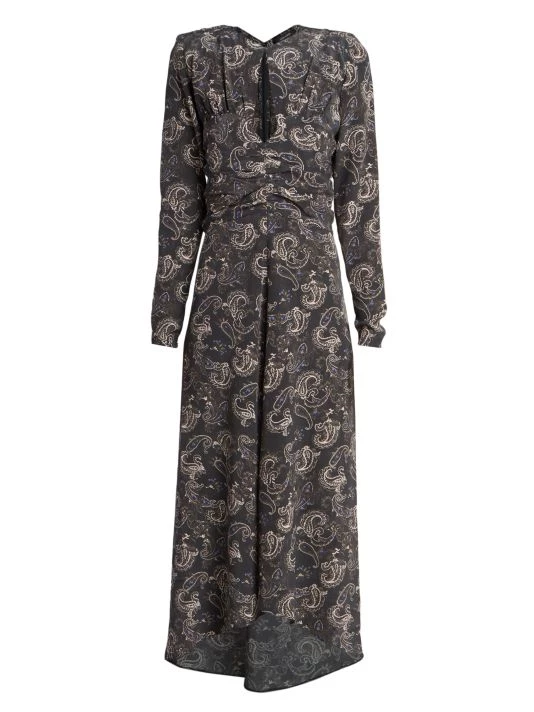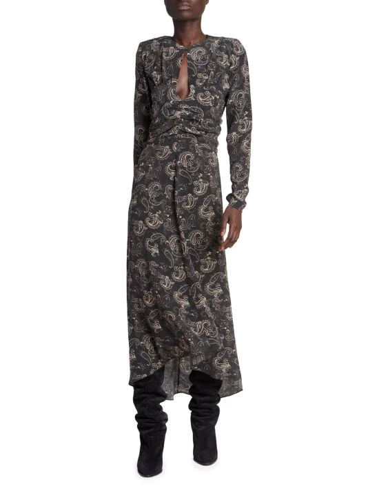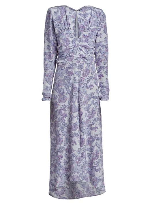 Isabel Marant’s Telima paisley dress is crafted of silk. Finished with a high-low hem, this midi-length style features a keyhole front, long sleeves with structured shoulders, and a ruched waist.